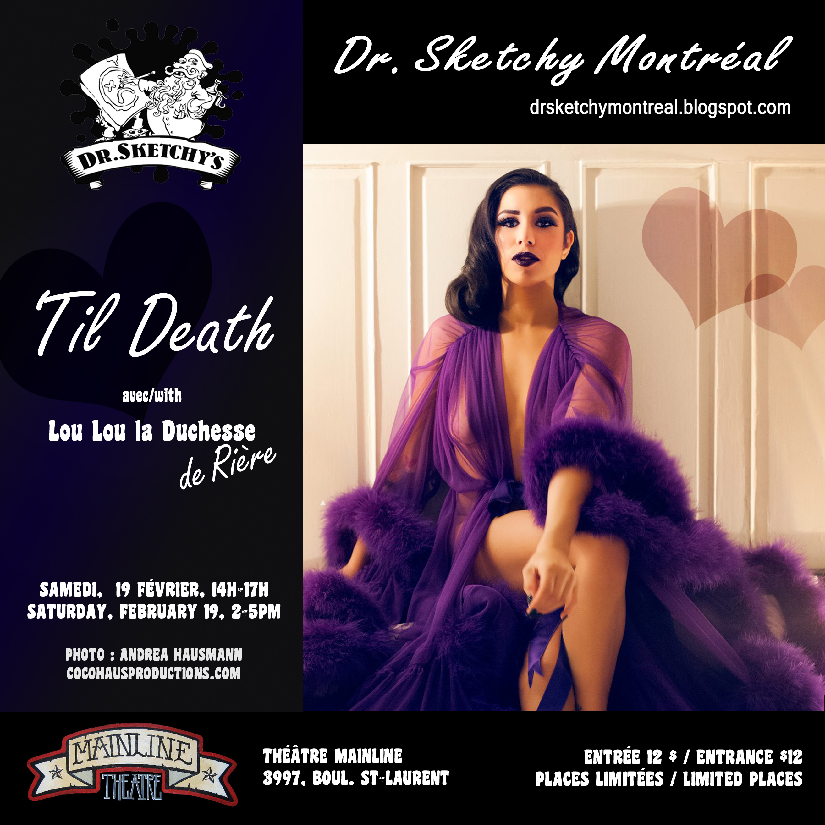 Dr. Sketchy Montreal is back and invites you to its next figure drawing session: 'Til Death. Come draw dangerous beauty Lou Lou la Duchesse de Rière. This femme fatale may have buried a few rich husbands, but shhhhh... We don't talk about that... Join us for our deadly Valentine session! 🖤
